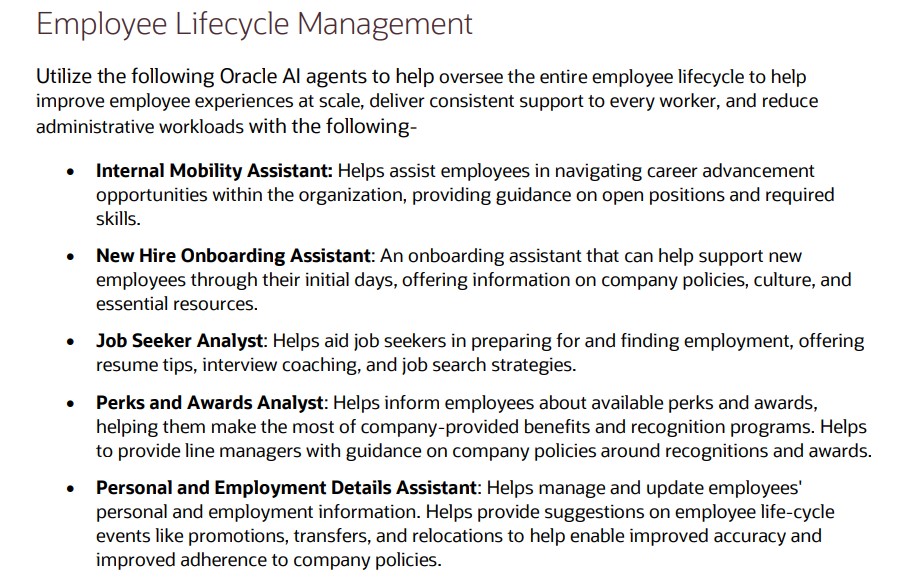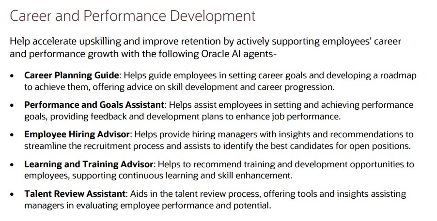 When it comes to career development, Oracle’s new agents offer some genuinely helpful features. Managers can get support with setting and tracking team goals, while employees receive tailored advice on roles that match their skills and aspirations. There’s even a Learning Tutor agent to help employees get more out of training courses, and a Talent Advisor agent that helps managers plan promotions and career growth using real performance data.