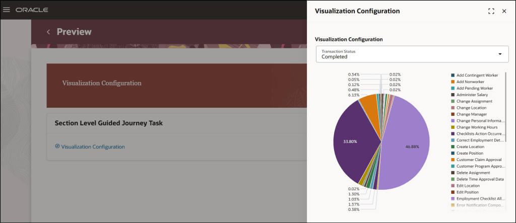 Another key focus for Oracle lately has been the embedding of Analytics into pages. As a data nerd I love any opportunity to embed a graph or other visualisation of data into a page. Oracle have now introduced a new enhancement to the Analytics task type in Journeys, the Visualization Configuration subtask, which enables users to seamlessly view Oracle Transactional Business Intelligence (OTBI) analyses, including any supported parameters, directly within a journey task. This integration allows for real-time insights and decision-making without leaving the task flow. It should be noted that users configuring these will not only need Journeys config access, but also security access to the new Visualization Configurator. There are three new privileges for this: ZCA_VIEW_DATA_VISUALIZATION_CONFIGURATION_PRIV, ZCA_MANAGE_DATA_VISUALIZATION_CONFIGURATION_PRIV and HRC_MANAGE_SYSTEM_SEARCHES_PRIV.