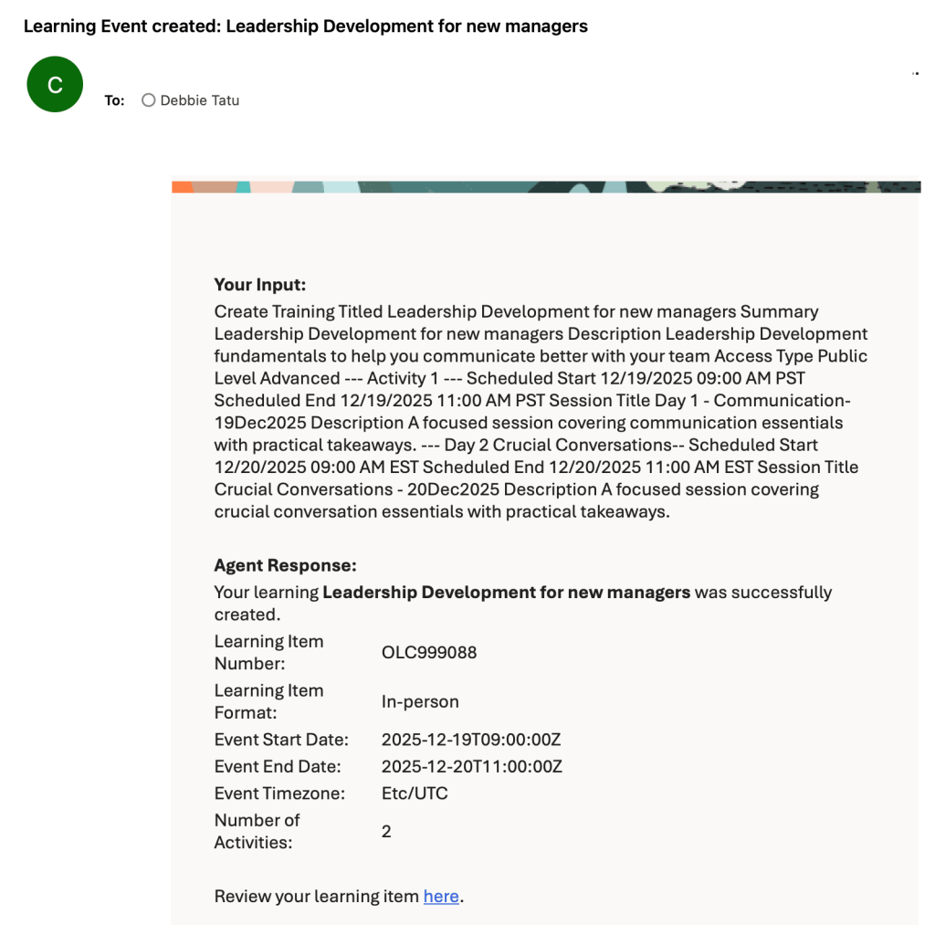 The enhanced Learning Creation Assistant now allows learning content to be created directly from email, making it faster and easier for instructors and learning teams to contribute new content. By simply sending instructions in the email body or as an attachment, users can generate a range of learning formats and receive a confirmation with a direct link to the draft item. This streamlined approach reduces administrative effort, removes reliance on complex workflows, and helps organisations accelerate knowledge sharing across the business.