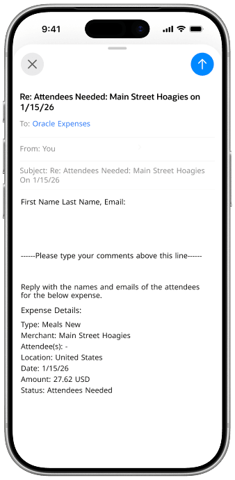 The Expenses Agent simplifies expense reporting by allowing employees to complete and submit expenses entirely through email, using natural language. Employees can forward receipts directly to the agent, which automatically creates the expense and prompts for any missing details, such as justifications, attendee information, or cost centres, via a simple email reply. Once all required information is captured, the expense is ready for submission or can be auto‑submitted in line with company policy. This conversational, email‑based approach reduces manual data entry, minimises errors, and cuts down on back‑and‑forth, accelerating reimbursements while improving compliance and delivering a far more intuitive experience for both employees and finance teams.