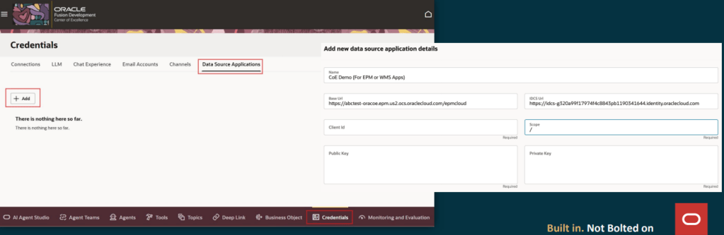 The relationship between Fusion and the outside world does not just work in one direction. In 26A, Oracle introduced Data Source Applications within the Credentials tab of AI Agent Studio, allowing administrators to configure OAuth connections to non‑Fusion systems such as EPM Cloud, WMS, or any external application with a compatible identity provider. Once a Data Source Application is set up with the base URL, IDCS URL, client ID, scope and key pair, it becomes available as a selectable source when creating a Business Object using the resource type “Other Data Source Application”. This makes it much easier for AI agents to securely reach out to external systems, bringing data back into Fusion in a controlled and repeatable way rather than relying on custom or hard‑coded integrations.