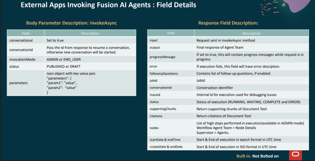 One announcement I haven’t covered yet is the invokeAsync REST API, introduced in 26A, which allows external applications to programmatically call published Agent Teams in Fusion, and this is a significant step forward for organisations where Fusion sits alongside other enterprise systems. It means those systems can now trigger Fusion AI agents directly, without a user ever needing to open the chat interface. The process works in two stages: an external application sends a POST request to the invoke endpoint, passing either a user prompt or structured data, and because AI agents may need time to reason or retrieve information, the call returns a job ID rather than an immediate response. That job ID is then used to poll a separate status endpoint, which returns the final output along with useful metadata such as status, conversation ID, trace ID and timing information. For development and testing, adding ?invocationMode=ADMIN to the status endpoint provides detailed debug output, including the full node execution trace, which is invaluable when you are building and troubleshooting. Authentication follows the standard OAuth 2.0 bearer token approach used across Fusion APIs, so if you are already familiar with OCI IAM and IDCS, there is nothing fundamentally new to configure.