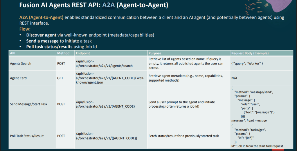 For those looking for a more standardised integration approach, Oracle also introduced support for the A2A, or Agent‑to‑Agent, protocol in 26A. A2A allows a client to discover agents through a well‑known metadata endpoint, often referred to as the agent card, initiate a task by sending a message, and then poll for the result using the same job ID pattern. The agents search endpoint makes it possible to query for published agents by name, which is particularly useful when you are building orchestration layers that need to dynamically discover and delegate work to specialist agents. The agent card itself returns the agent’s capabilities and supported methods in a structured format, making it much easier to establish interoperability between Fusion agents and third‑party systems without relying on custom, point‑to‑point integrations.