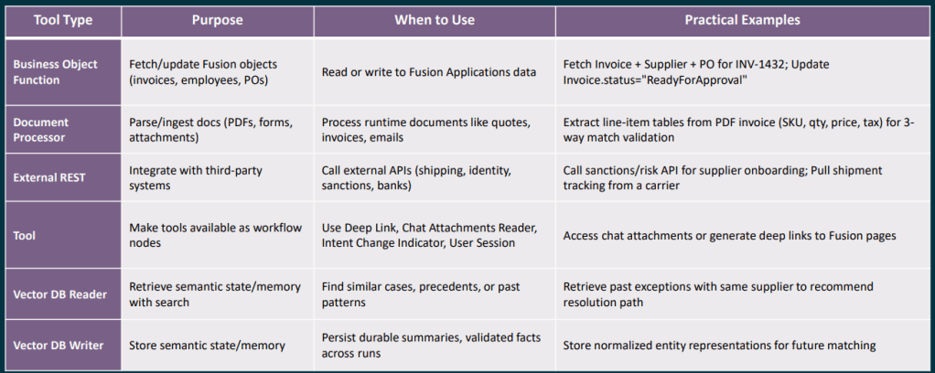 Choosing the right document or memory node is an area where I see a lot of confusion in conversations with clients, so it is worth being very clear about what each one is designed to do. The Document Processor node is intended for runtime documents, attachments that arrive as part of a specific workflow execution, such as a supplier quote received by email, an invoice uploaded through chat, or a UCM attachment linked to a Fusion business object. Its job is to retrieve the file, extract the text, and pass that content on to the next node in the workflow. It is not designed for querying a stable or long‑lived corpus of documents, such as policy or reference material that you want to reuse and search repeatedly over time.
