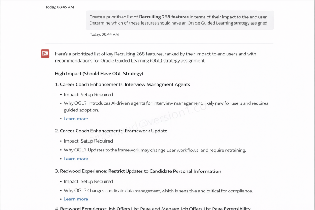 Are you aware of the opportunity to use Success Navigator’s AI Assist to help produce OGL Content? On a recent webinar the presenter asked AI Assist to produce a prioritised list of Recruiting 26B features ranked by end-user impact, with a recommendation on which should have an OGL strategy assigned. The output was a ranked list classifying features as high, medium, or low impact, with a clear rationale for each. Features like Career Coach Enhancements (Interview Management Agents) and the Redwood Experience changes to candidate data management were flagged as high impact, with specific reasoning around setup requirements and workflow changes for end users.