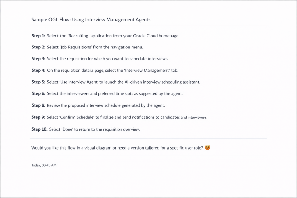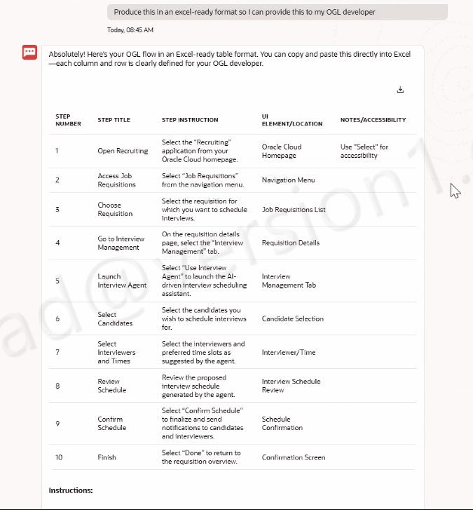 The next step was even more useful. Having identified that the Interview Management Agent feature needed OGL coverage, the presenter asked AI Assist to produce a sample OGL flow. The output was a structured, step-by-step guide covering navigation path, UI element locations, and accessibility notes. When the presenter asked for it in an Excel-ready format, AI Assist reformatted the output into a table with columns for Step Number, Step Title, Step Instruction, UI Element/Location, and Notes/Accessibility, ready for an OGL developer to pick up directly.