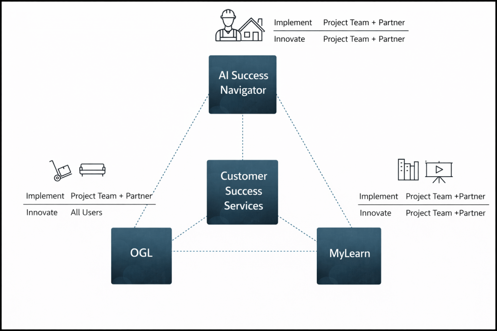 AI Success Navigator, OGL, and MyLearn are all interconnected and Oracle’s Customer Success Services sits in the middle of each. AI Success Navigator is the planning and intelligence layer and OGL is the point-of-need delivery mechanism inside the application. During implementation, OGL is primarily the concern of the project team and partner. Post-go-live, it becomes relevant to all users. MyLearn is the key mechanism for users to learn about Oracle Fusion and therefore is an important consideration.