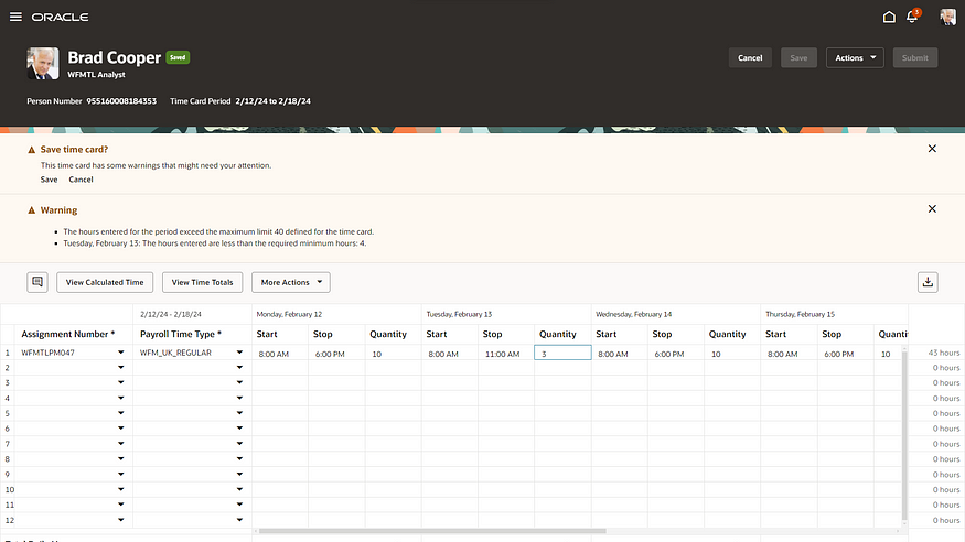 Whilst there are a significant number of Redwood features in the 24B Time and Labor release, I can’t cover them all in this post. The final key feature I wish to highlight is the new Redwood Review of Warnings page. When an employee or line manager saves or submits a timecard, a warning may be received. The new Warnings page allows the user to review these warnings and correct if necessary, immediately at the point of submission. It’s a much more user-friendly page and provides easier to understand messages with recommendations on how to resolve the warnings.
