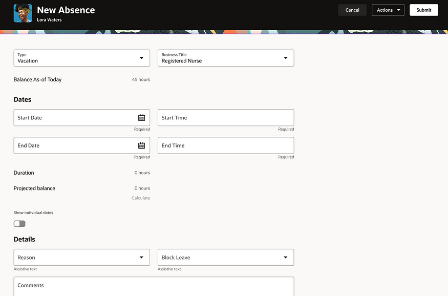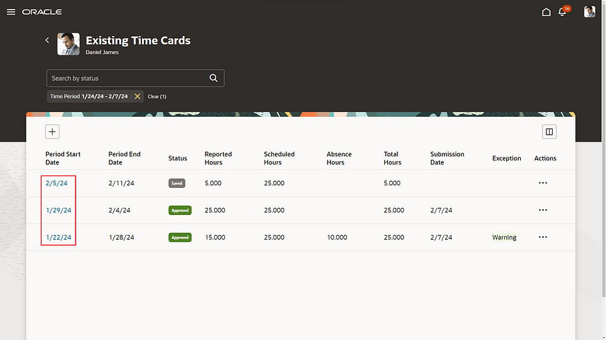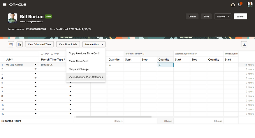 The first feature I also mentioned in my Absence 24B blog, but it’s important for those who use Time and Labor. Oracle have provided users the ability to view absence plan balances directly in the Redwood Time Card. This will save employees from having to check their balances in the absence area and then go back to their time cards to log the absence.
